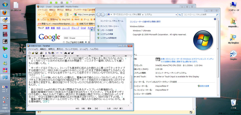 画面の解像度が1600×768あるので正直文字はめちゃくちゃ小さい。画面サイズ8インチだしね。でもまあギリギリ行ける感じ。Webとかみてて細かい表示のときは画面に顔近づけないと読めなかったりするけど、やはり圧倒的な表示領域の広さの快適さはありがたい。OQOの3倍ですよ3倍。